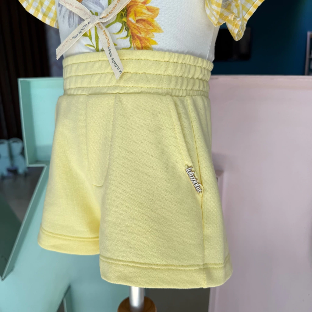 Conjunto infantil feminino Girassol Xadrez - Luluzinha. Blusa confeccionada no cotton off white, gola redonda, manga curta evasê xadrez amarelo candy, linda estampa de girassol com aplicação de cristais. Short confeccionado no moletom amarelo candt, cós com elástico embutido, bolsos.