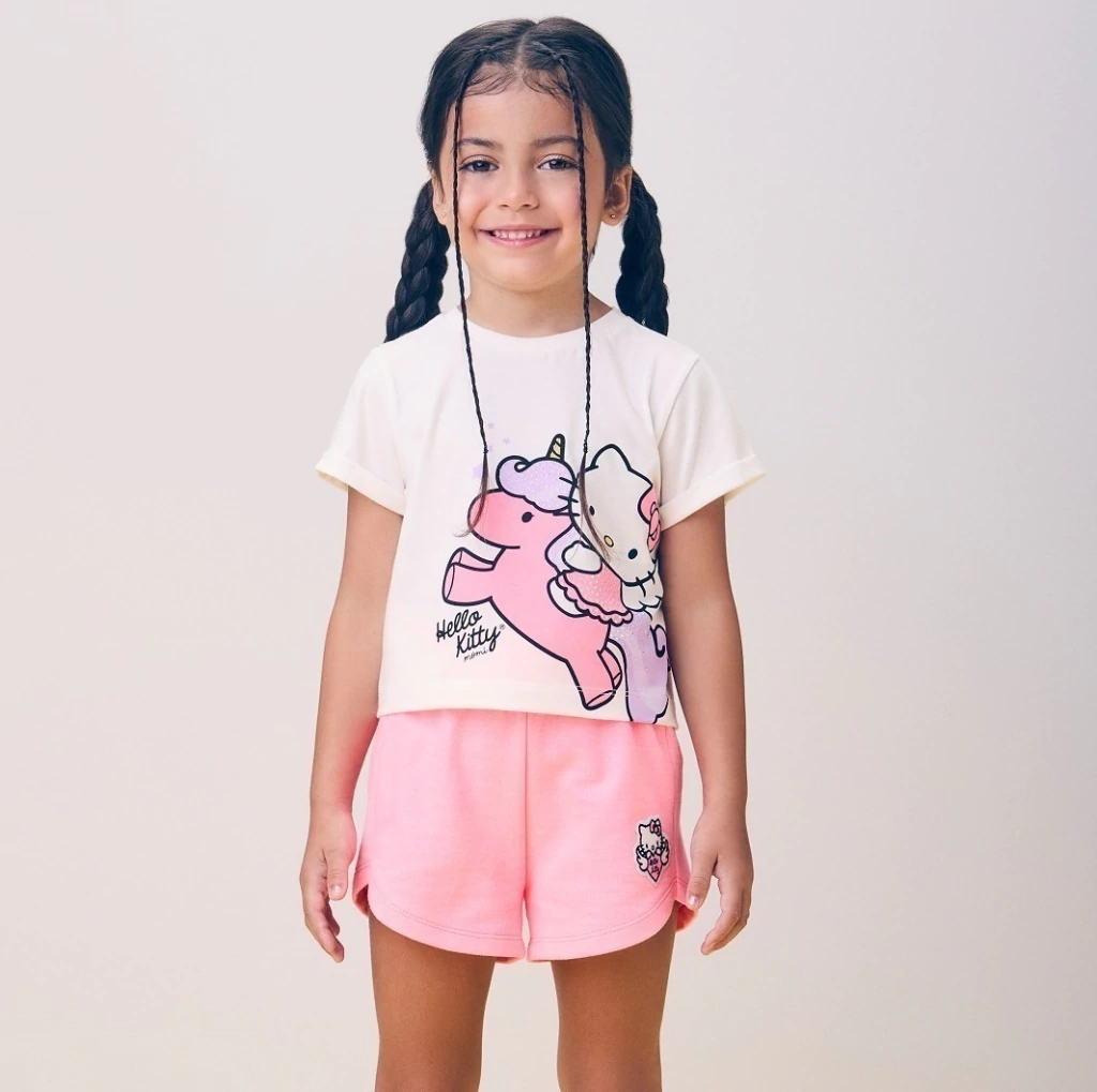 Conjunto infantil feminino Hello Kitty Unicorn - Momi. Blusa confeccionada no cotton off white, gola redonda, manga curta, linda estampa neon Hello Kitty com aplicação de cristais. Short confeccionado no moletom cotton rosa, cós com elástico embutido.