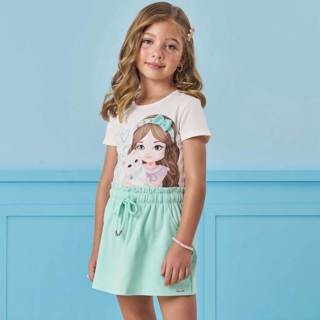 Conjunto infantil feminino Sweet Hugs - Infanti. Blusa confeccionada na malha cotton branca, gola redonda, manga curta, linda estampa com aplicação de cristais, pérolas e lacinho de tule. Short saia confeccionado na malha canelada verde água, cós com elástico embutido e ajuste.