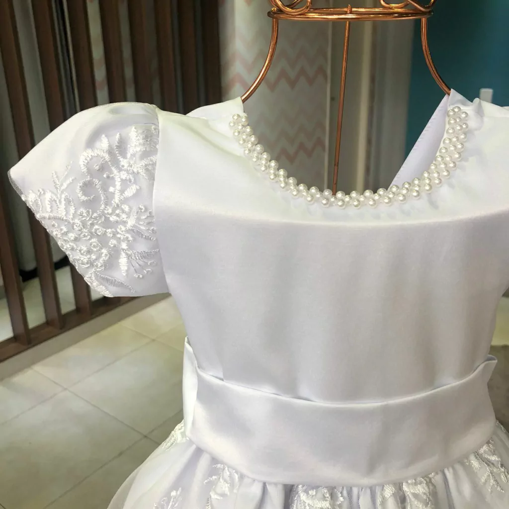 Vestido Batizado Princess Renda Pérolas - Rociclê - confeccionado no cetim branco, sobreposição no tule rendado branco na saia.Todo forrado com tecido macio e confortável, tutu para volume no meio. Decote redondo bordado com pérolas, manguinha curta com tule rendado e abertura nas costas com botões. Faixa branca acompanhando a cintura finalizando com laço estruturado e entretela nas costas. Decote V nas costas. Acompanha faixa.