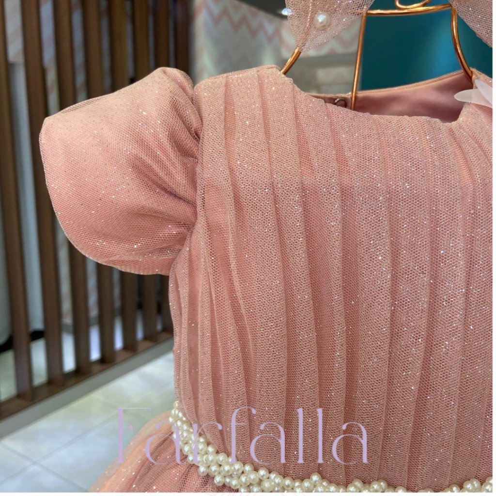 Vestido de festa infantil Bianca Jardim Encantado Rosê - Farfalla - rosa seco, sobreposição no tule brilho prata com pérolas e borboletas 3D rosa. Todo forrado com tecido macio e confortável e saia dupla de filó para armação do vestido. Cinto de pérolas, manguinha boneca, tule drapeado no busto. Abertura nas costas com botões pérola e decote coração. Maxi laço removível nas costas.
