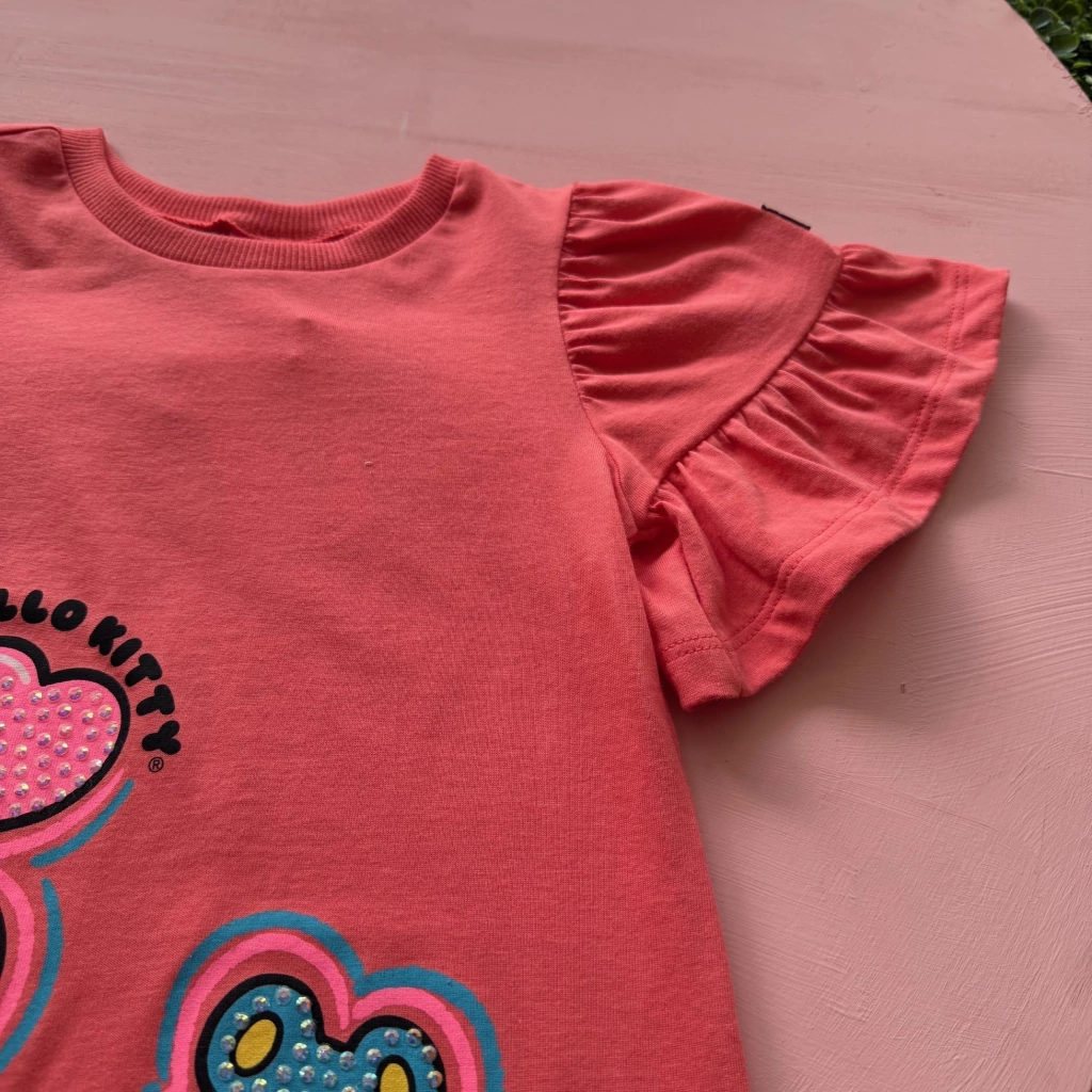 Vestido infantil Hello Kitty - Momi - confeccionado na malha cotton coral watermelon com aplicação de cristais. Decote gola redondo, manga curta.